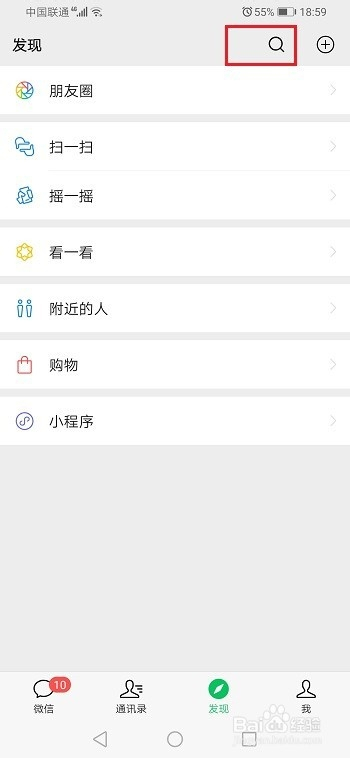 第一步在我们的手机里面打开微信,点击搜刮图标,如下图所示: