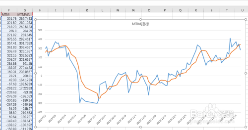 将数据的图例项设置为MTM和MTMMA列,X轴坐标设置为日期列。MTM指标就以图表的形式显示出来了。