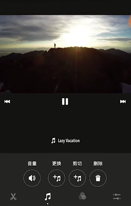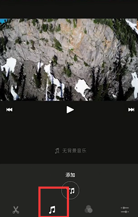 - 3在接下来的界面中,点击屏幕底端第二个“音符”按钮,给视频添加布景音乐。