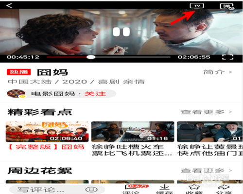 在手机上囧妈播放视频上点击“TV”功能键,视频即可投屏到电视上了。