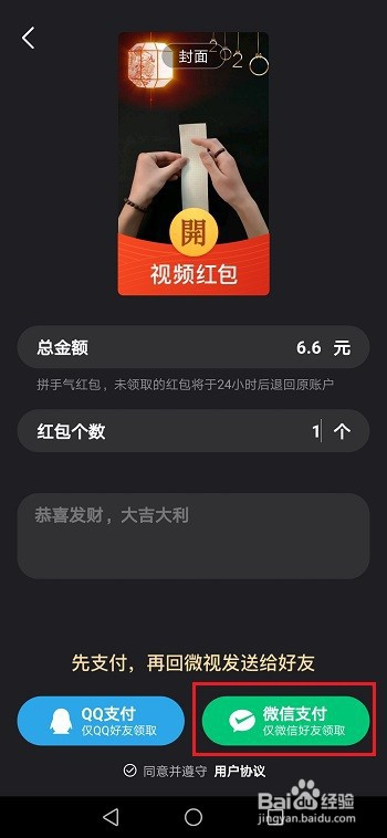 第五步输入红包金额和个数,进行支付,支付完当作之后,发给老友就完当作了,如下图所示: