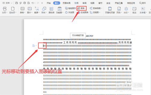 【3】在文档中把光标移到需要插入图表的位置,之后在“插入”页面上,点击“图表”;