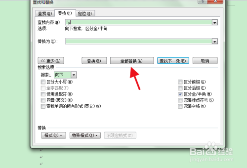5.同理,选择“空白区域W”进行全数替代,此外还可将多余的句号进行转换为逗号等。