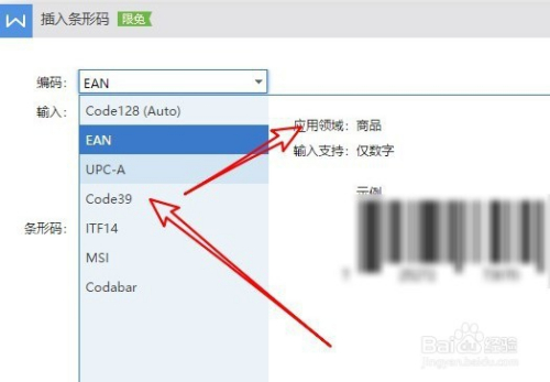 4、这时会打开插入条形码的窗口,选择编码下拉按钮。