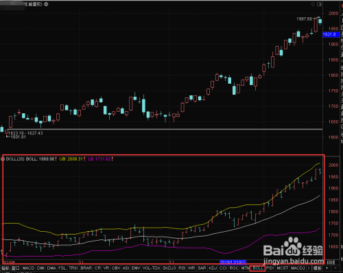起头前我们先领会一下BOLL指标的组成,它由布林中线BOLL(收盘价的M日简单移动平均值)布林上轨UB(BOLL+2*收盘价的M日估算尺度差),及布林下轨LB(BOLL-2*收盘价的M日估算尺度差)三个指数组成,默认M为20天。