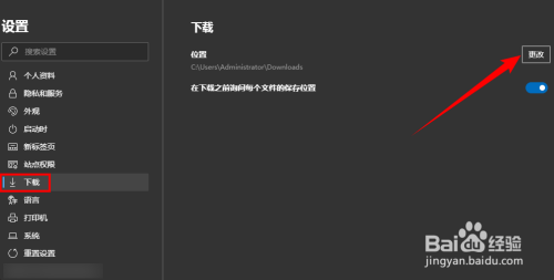 点击左侧的【下载】,再点击“位置”后面的【更改】按钮,可以自界说下载路径,还可以设置下载前是否提醒下载位置,如下图所示: