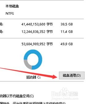 在弹出的C盘属性对话框,点击常规页签列表框底下的磁盘清理按钮进入。