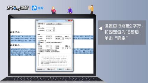 - 4设置首行缩进两个字符,固定值为18磅,点击“确定”。