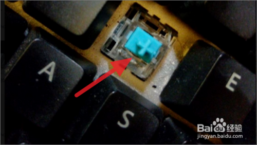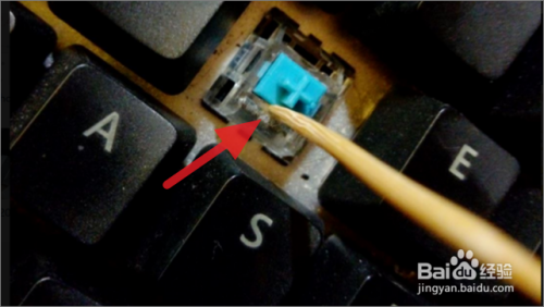 然后在我们找到轴体下有一条小缝,用我们沾了酒精的牙签,插入轴体下的小缝中