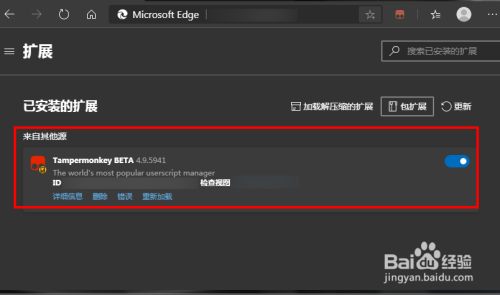 这样“Tampermonkey”插件就安装好了,可以在“已安装的扩展”中看到,并显示其来历为“来自其他源”,如下图所示: