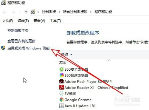 这时会打开程序和功能窗口点击启用和封闭windows功能的快捷链接。