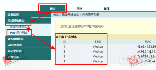登录当作功后,在WIFI路由器办理本家儿页,点击“状况——无线收集状况——WIFI用户列表”,在这里我们能清晰的看到毗连WIFI的用户数目,如图所示: