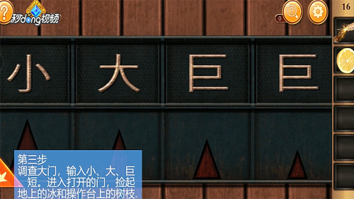 - 3大门上输入小,大,巨,短。进入打开的大门,捡起地上的冰和操作台上的树枝。
