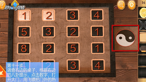 - 11右边的桌子,按照右边的八卦提醒,点击数字,打开大门,用飞镖把热气球打下来。