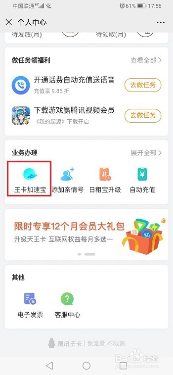 第三步下面来开通王卡加快宝,微信打开公家号王卡助手,进去之后,点击特权->小我中间,如下图所示: