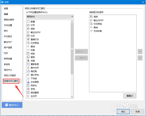 【3】在“选项”对话框左侧,点击“快速拜候东西栏”;