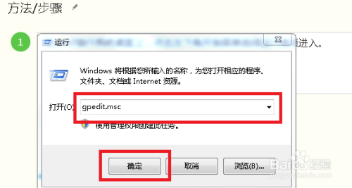 在弹出的运行对话框,输入gpedit.msc号令点击确定按钮进入。