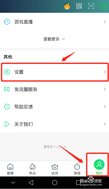 进爱奇艺本家儿页,点击“我的”,然后点击“设置”。