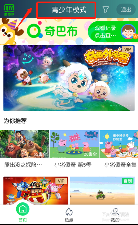 爱奇艺页面上方显示“青少年模式”。