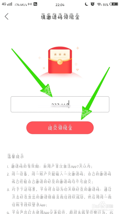 第六步,填写伴侣的邀请码,点击提交领现金即可领取收益。