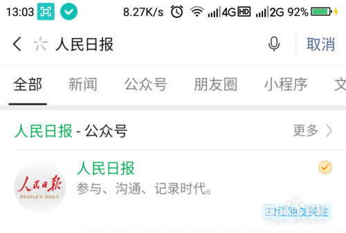 打开【手机微信客户端】,点击右上方的【搜刮】,输入【人平易近日报】。