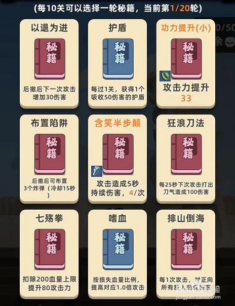 进入交锋大会后,需要选择技术,我们优先选择进犯力、金钟罩、血量晋升、暴击、一阳指、吸血、葵花宝典、翻江倒海、春风剑法巨浪剑法等可以晋升血量、危险、增强防御的技术。