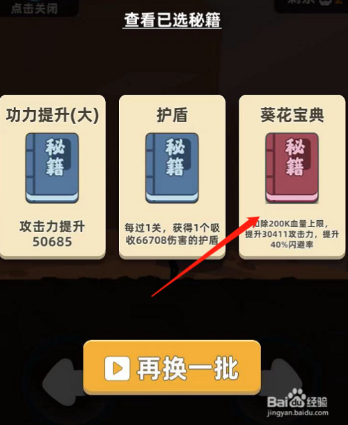 在技术选择上我们看到葵花宝典建议选上,可以提高闪避,对遁藏进犯很有用果。如图所示