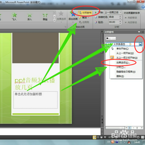 第五步,点击右上方的“动画窗格”按钮,在弹出的动画窗格中选中插入的音频,后面的“黑色三角”下拉按钮,点击“结果选项”。