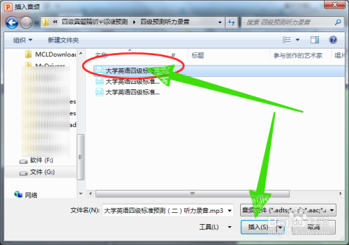 第二步,在插入音频弹窗中,选择我们要插进PPT文件中的音频,点击“插入”按钮。