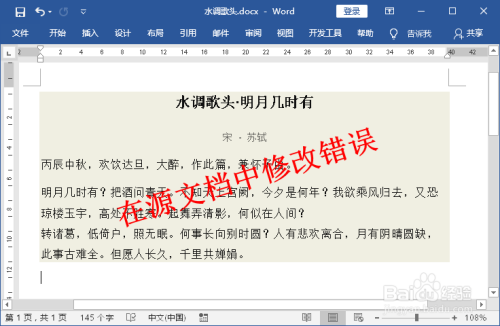 如下图的 Word 文档中有一首词“水调歌头”,里面有一些错误,需要直接在正文中进行点窜,应该怎么实现呢?