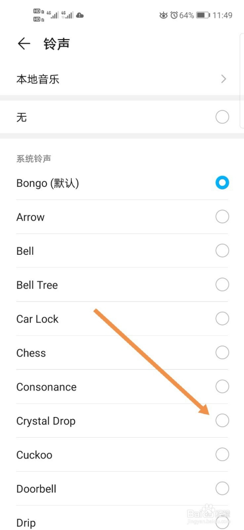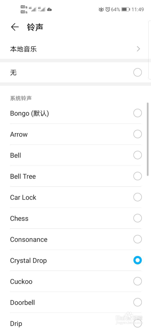 可以看到默认的铃声为Bongo,遴选一个本身喜好的铃声(这里以Crystal Drop为例)点一下选中