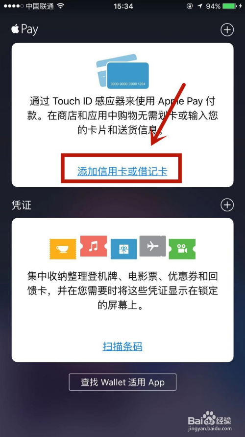 1.打开wallet,点击页面的添加信用卡或借记卡。