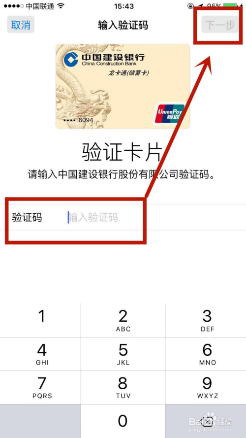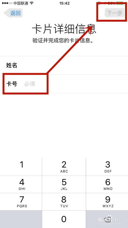 3.点击下方的手动输入卡片具体信息,输入卡号后点击右上角的下一步。