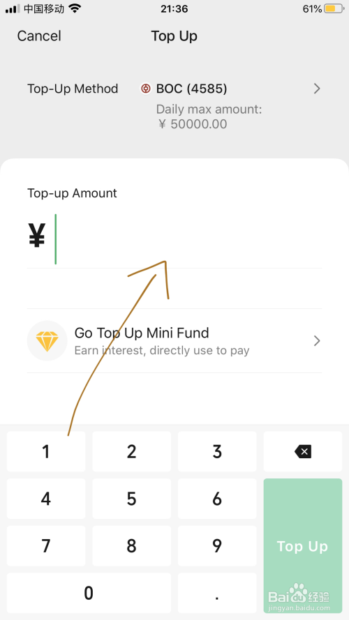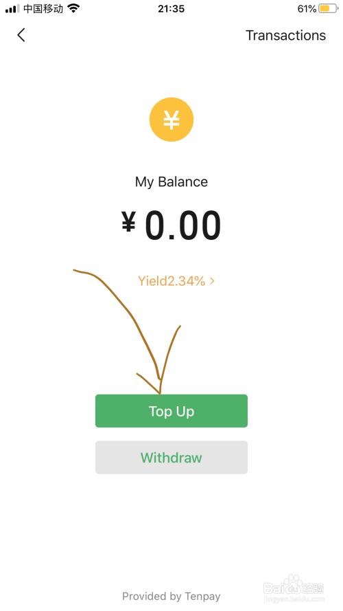在“零钱”界面,点击“充值”即“Top up”按钮。