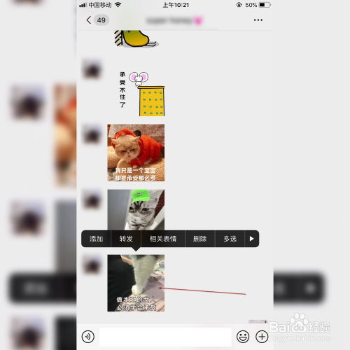 第三步,我们选中想要进行斗图的图片,长时候按住图片一会,可以看到关于图片的选项,如下图所示: