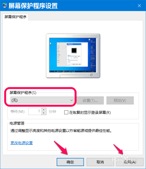 将屏幕庇护程序设当作【无】,再点击:应用 - 确定。