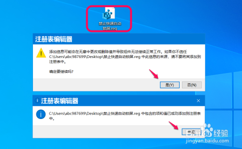 在系统桌面上找到并左键双击【禁止快速主动锁屏.reg】注册表文件图标,在先后弹出的注册表编纂器对话框中点击:是(Y)和确定。