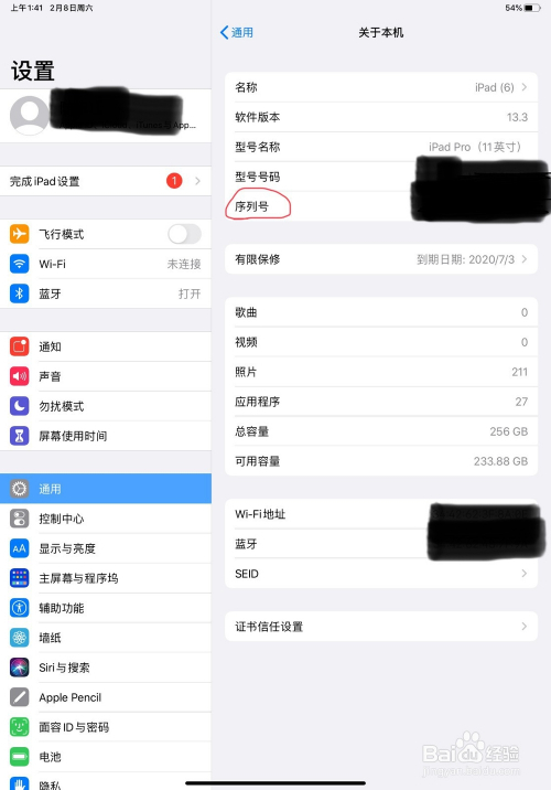 打开【关于本机】之后,我们就可以查到iPad的序列号以及型号号码。