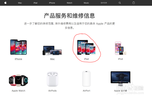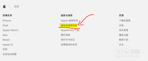 点击苹果菜单栏目里面的【手艺撑持】。下拉屏幕到最下面,找到【办事和维修信息】点击进入。