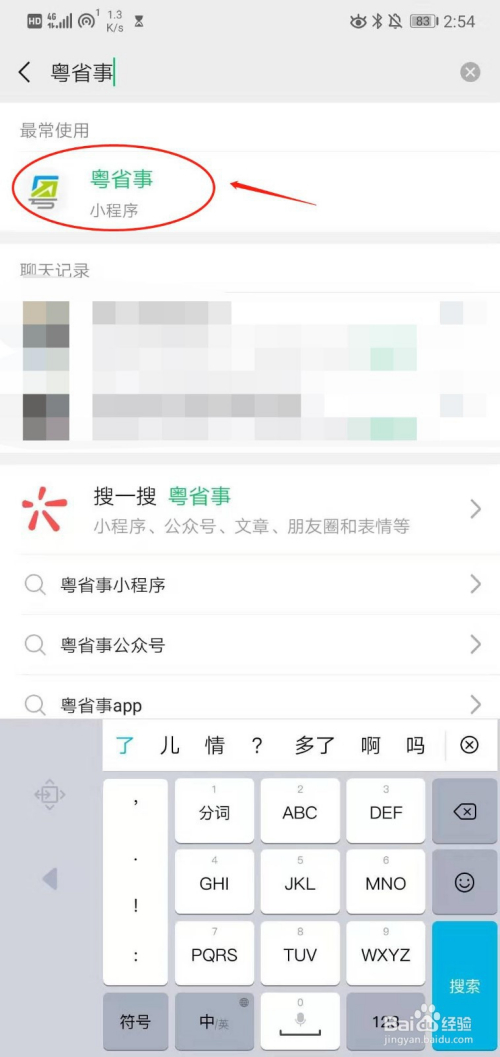 1.打开微信,搜刮“粤省事”,找到小程序。