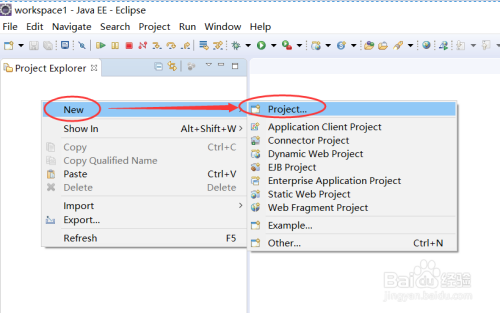 我们在左侧空白区域右键,选择”New“->”Project“,如下图所示: