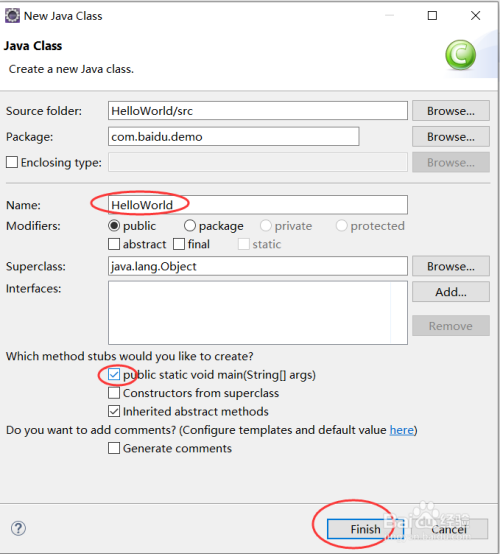 接着输入类名,然后勾选main方式,然后点击Finish,如下图所示:
