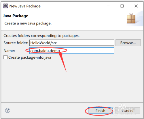 我们输入包名,然后点击Finish完当作包的建立,如下图所示:
