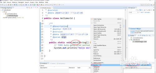 我们在main方式页面中右键选择”Run As“->”Java Application“,如下图所示: