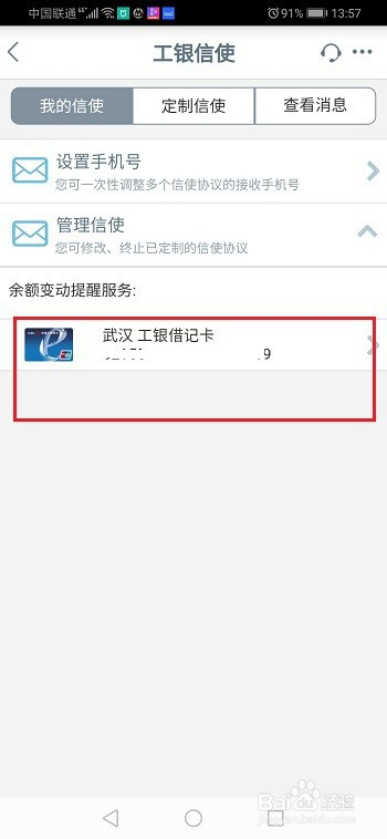 第二步进去工银信使界面之后,点击办理信使,选摘要打消的银行卡,如下图所示: