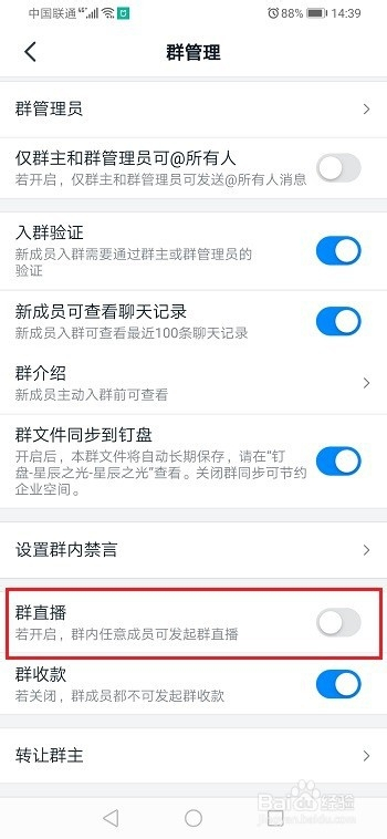 第四步点击封闭群直播,只有群本家儿和办理员可以进行群直播,如下图所示: