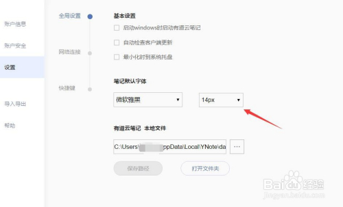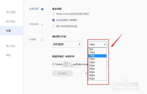 进入设置后,点击“笔记默认字体大小”下拉框。