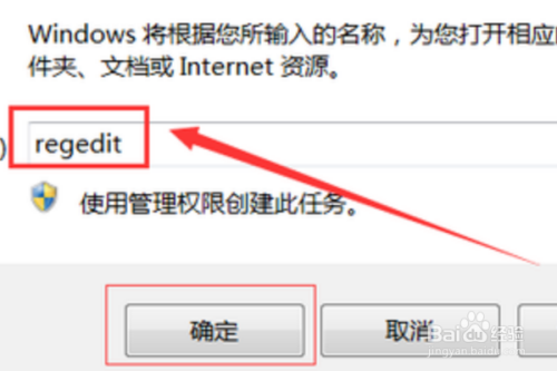 打开栏输入“regedit”,点击确定。