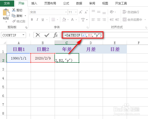 首先计较年差,在对应的空白单位格中输入公式:=DATEDIF(A2,B2,"y"),具体如下图所示: