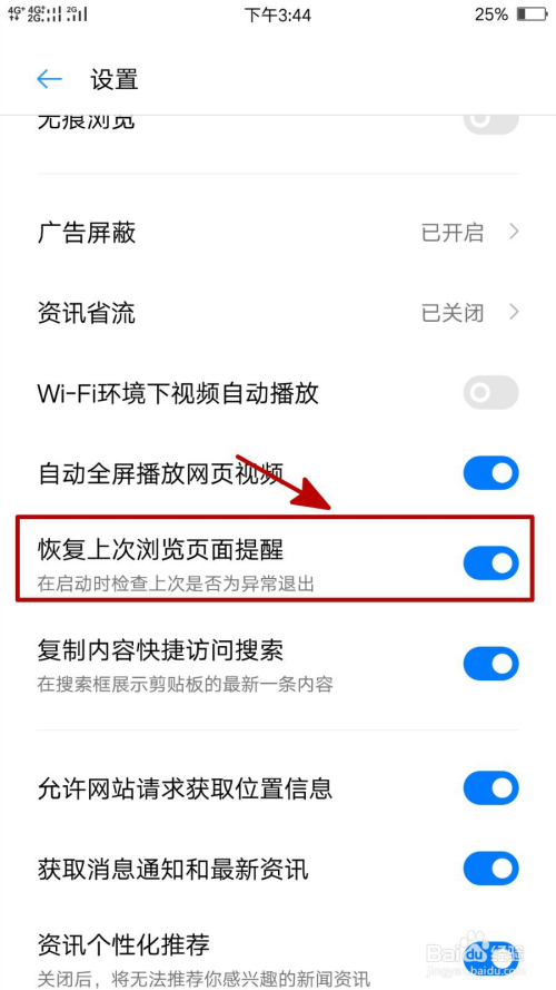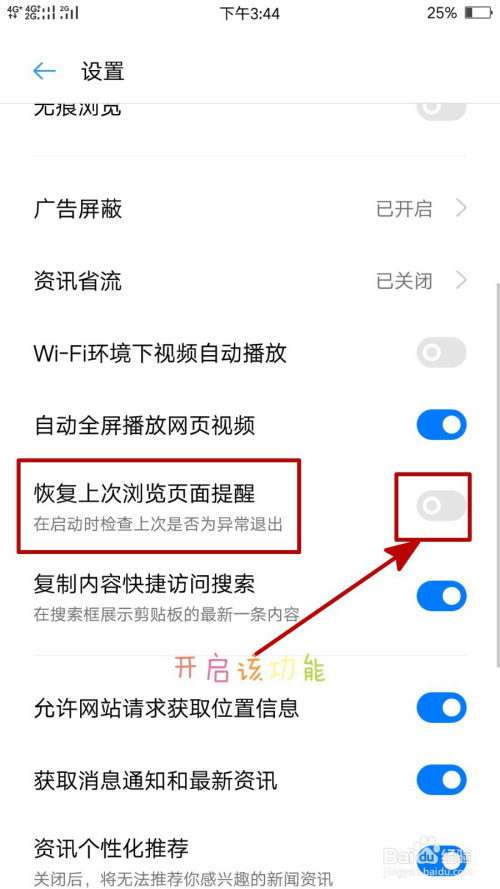 我们找到恢复前次浏览页面提醒功能,可以看出该功能今朝并未开启;